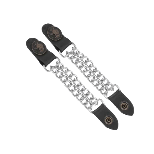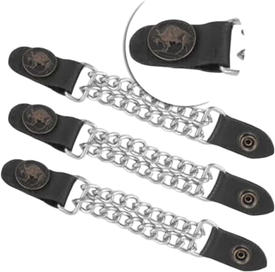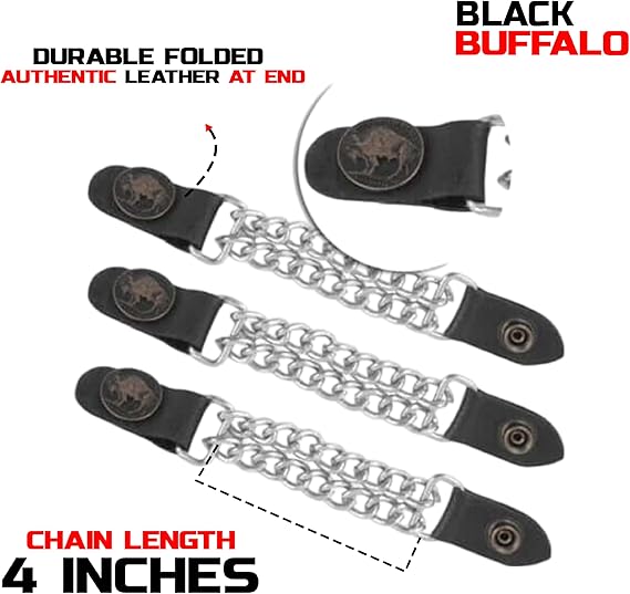 Enhance your biker gear with this stylish and functional vest extender, crafted from premium black genuine leather and adorned with a classic buffalo nickel design. Featuring a durable chain, this extender adds a rugged, timeless touch to your motorcycle vest or jacket.