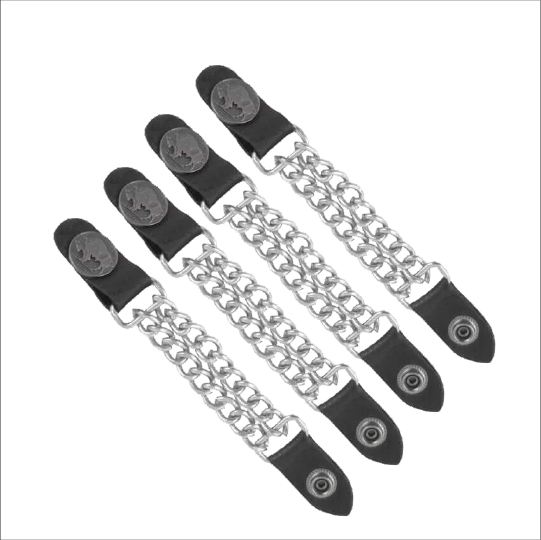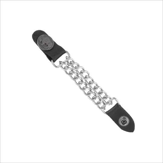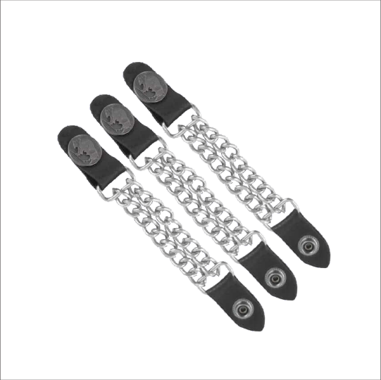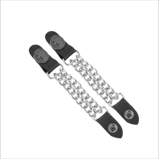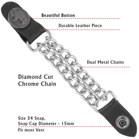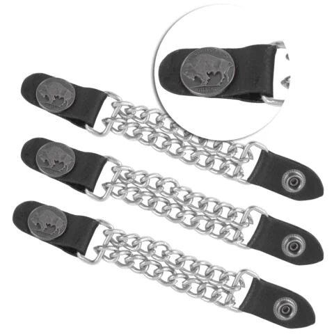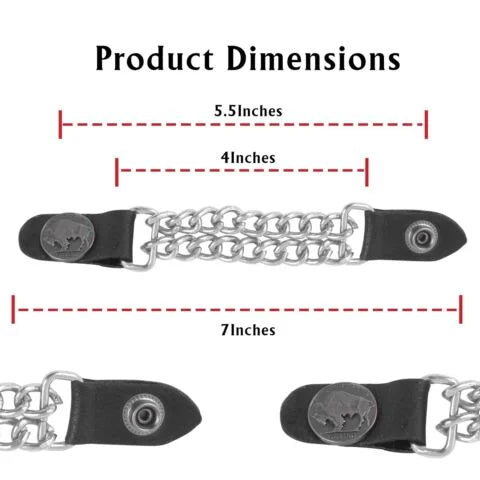 7" in length with a double chain design. These vest extenders are crafted from high-quality materials, featuring rust-resistant chromed chains, authentic cowhide leather, durable snaps, and intricate pewter designs with various styles available.