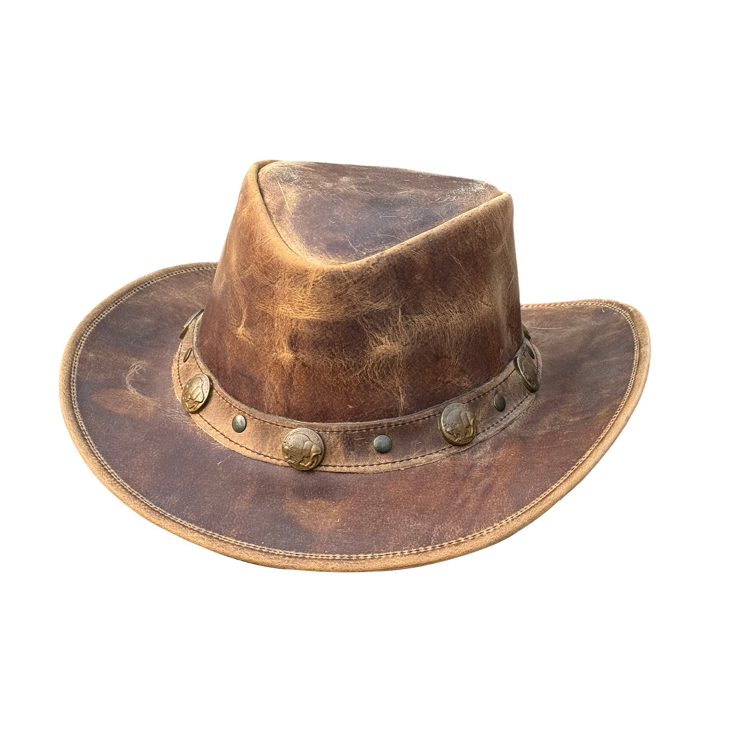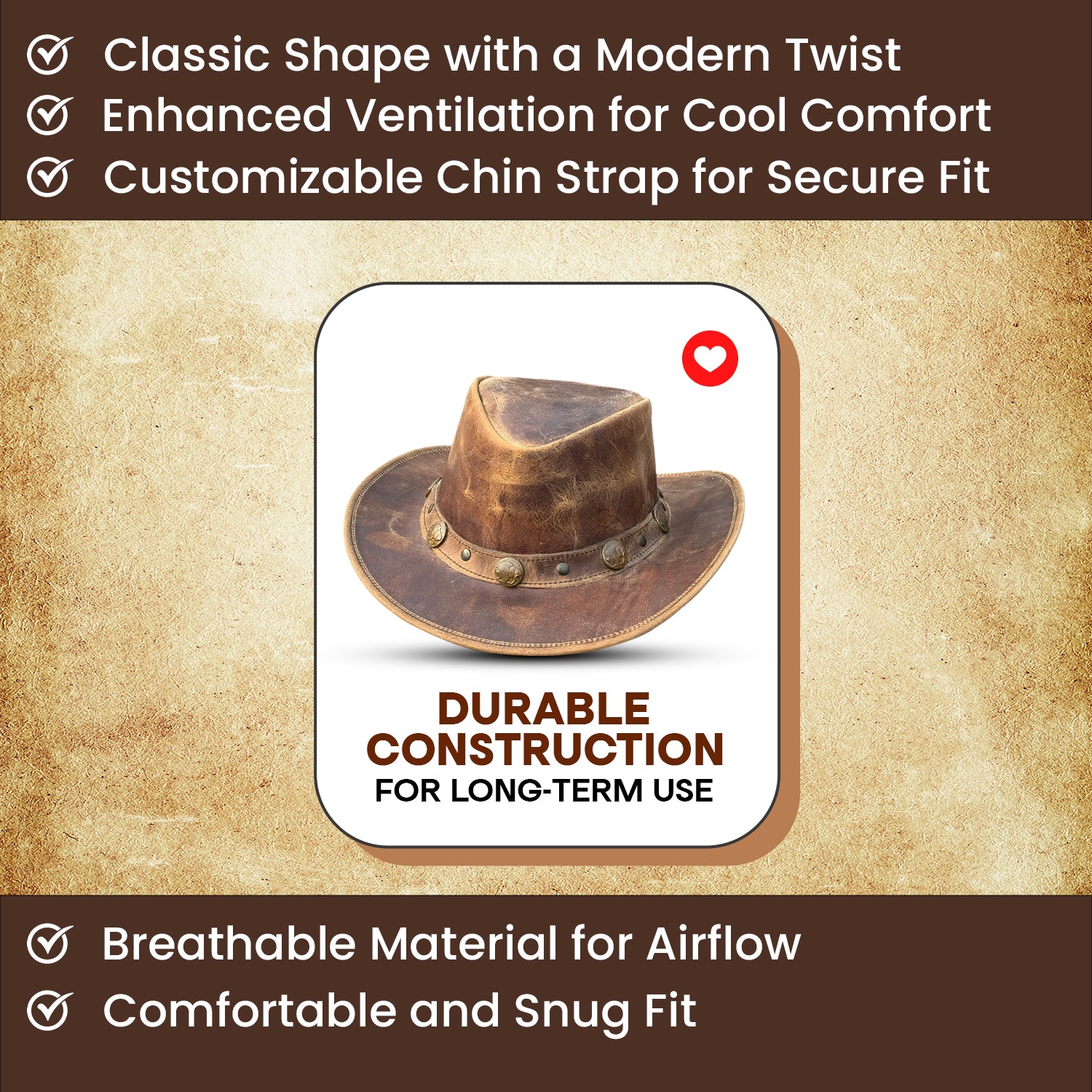 The men's cowboy hat is adorned with a leather band featuring buffalo coin details and metal studs, offering a distinctive and bold appearance. For a secure fit, the removable chinstrap ensures your hat stays in place, even on windy days or during active outings.