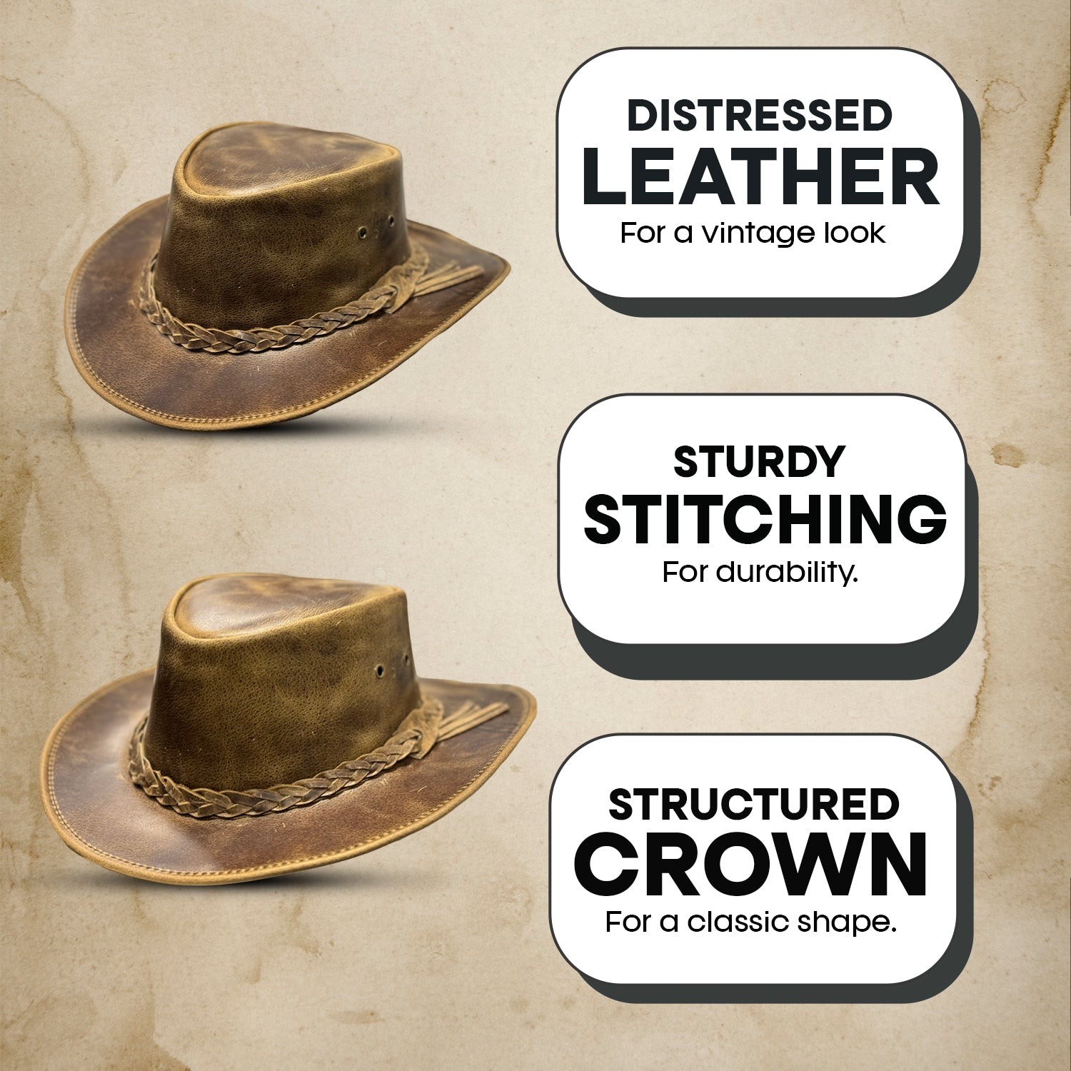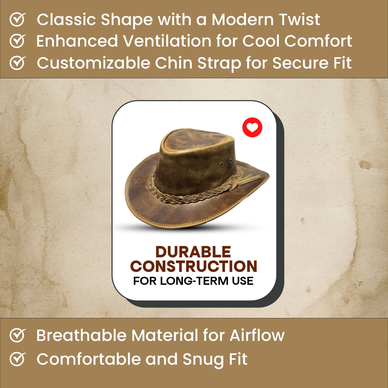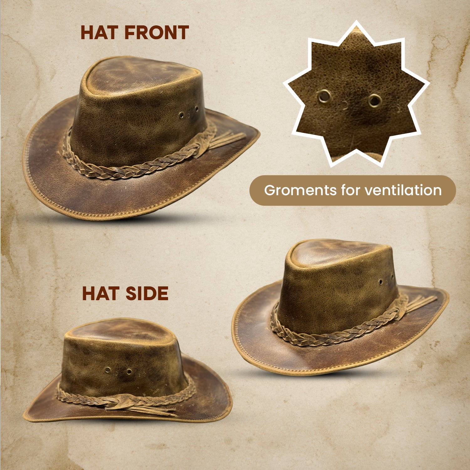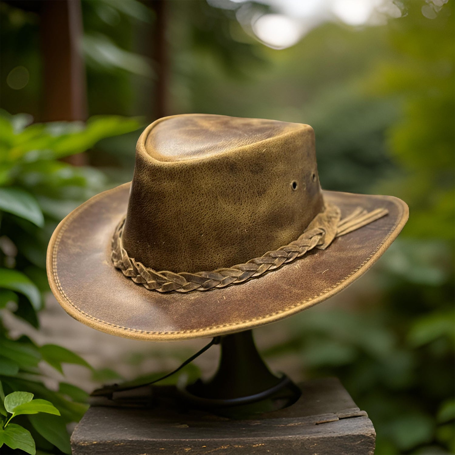 Experience the ideal mix of rugged charm and practicality with our rodeo men's cowboy hat. Crafted from genuine distressed cowhide leather, this sombrero vaquero para hombre offers a vintage, weathered look that’s perfect for outdoor adventures or adding a bold Western touch to your everyday outfits.