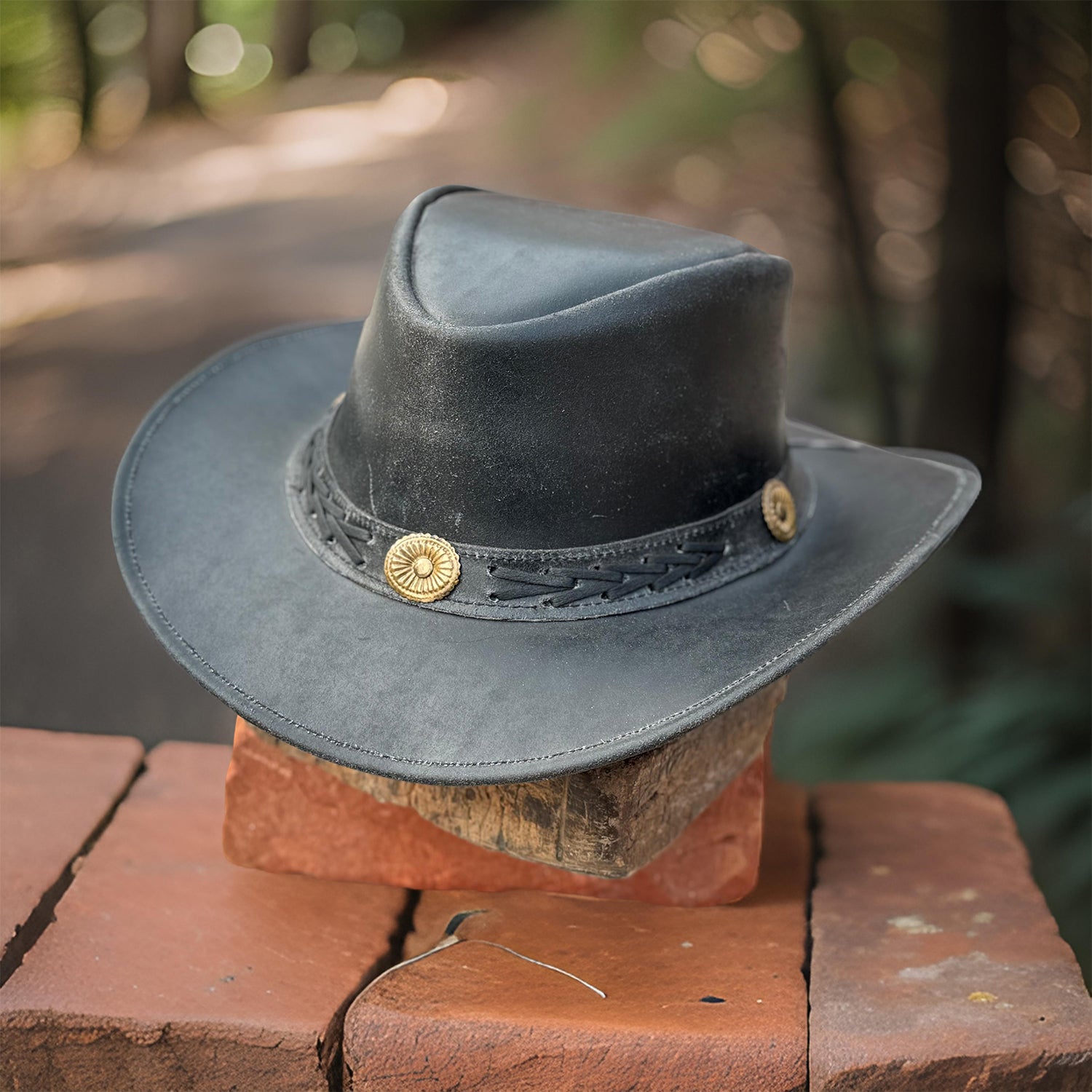 Capture the essence of Western tradition with our men's cowboy hat, crafted from high-quality black cowhide leather, delivering a bold and rugged look. The shapeable brim allows you to adjust the cowboy hat to suit your style, providing you the freedom to showcase your unique Western spirit. Accented with a leather band featuring brass Conchos and detailed stitching, this cowgirl hat blends style with timeless tradition.