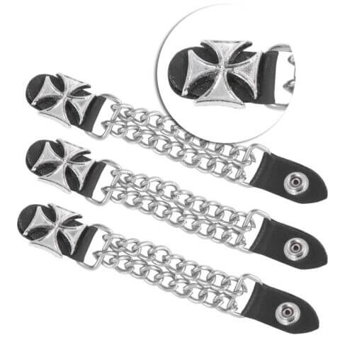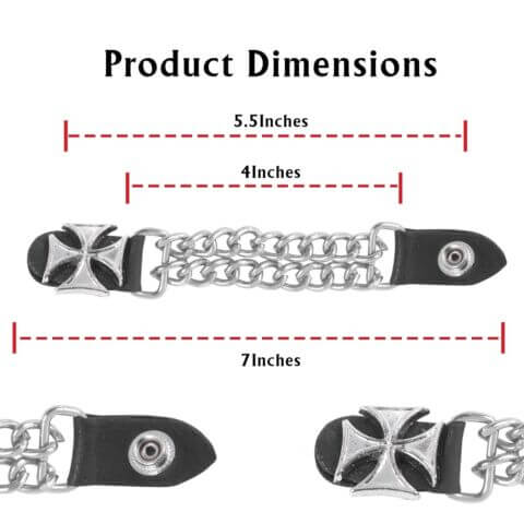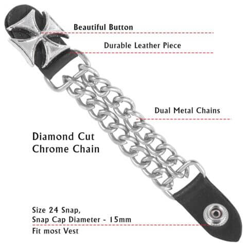 7" long with a dual-chain design. These vest extenders are crafted from premium materials, including rust-resistant chrome chains, genuine cowhide leather, heavy-duty snaps, and stylish pewter accents, available in various designs.