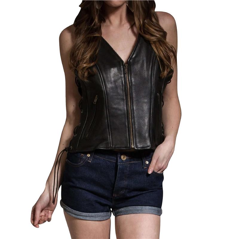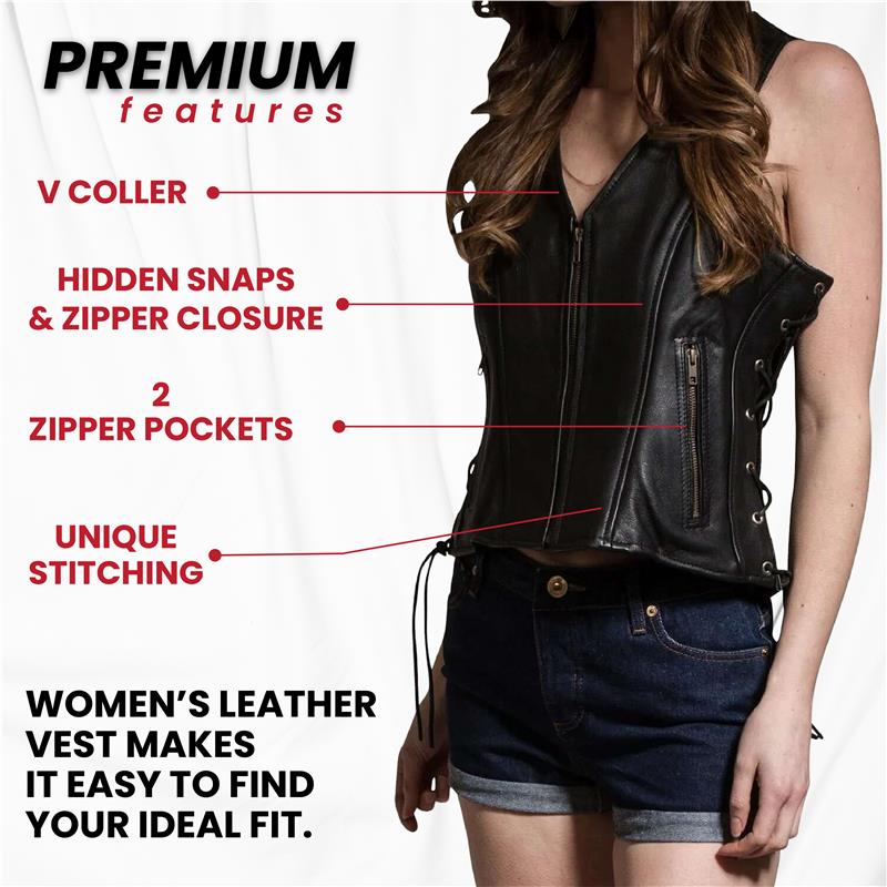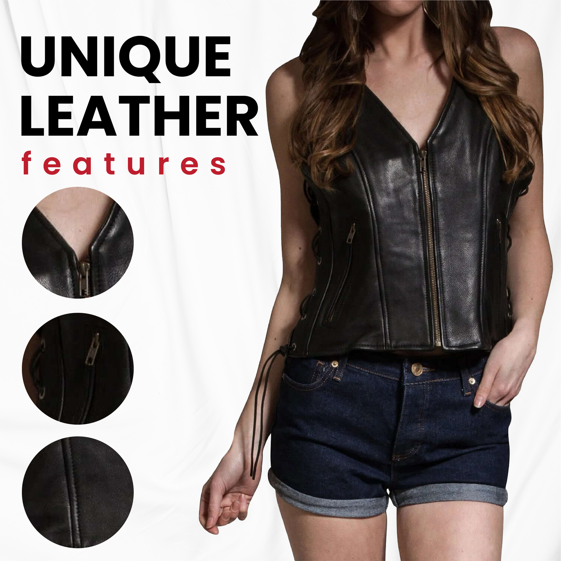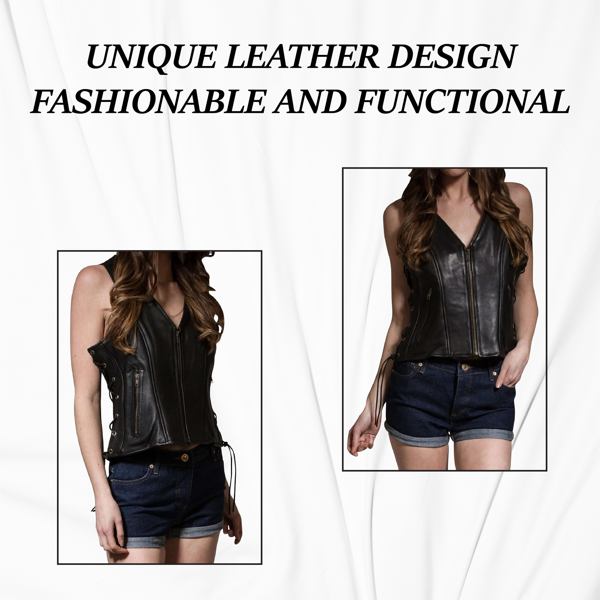 Elevate your wardrobe with this women’s leather motorcycle vest, crafted from genuine cowhide leather for durability and a premium feel. Featuring a stylish V-neckline and a sleek vertical zip closure, this vest offers a modern look that’s perfect for various occasions.
